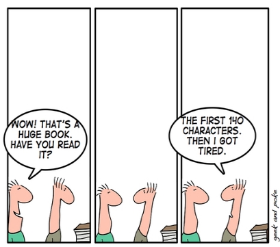 Twitter favorise la lecture… Publié 4 avril 2009 à 409 × 361 dans Les petits plus de Twitter et Facebook Suivant → – Wow, c’est un gros livre. L’as-tu lu? – Les 140 premiers caractères. Après je me suis lassé. – Wow, c’est un gros livre. L’as-tu lu? – Les 140 premiers caractères. Après je me suis lassé. (Geek & Poke)