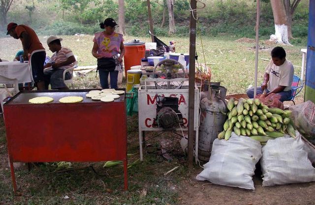 De droite à gauche : la matière première, le maïs; l’égrenage; l’obtention de la pâte dans un moulin électrique rudimentaire; la cuisson (photo : Philippe Prout)