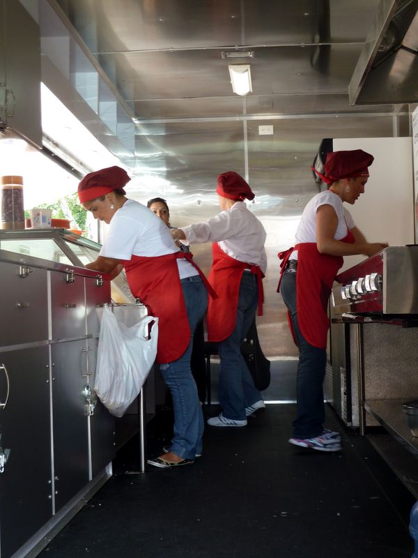 Renseignements pris, le camion tout neuf venait d’arriver à Mérida et en était à ses premiers essais. À l’intérieur, tout était impeccable. Trois jeunes filles s’affairaient au service, sous la supervision d’un homme qui devait sans doute faire office de gestionnaire (les rôles sont respectés…). Dehors, la file n’était pas très longue. Quelques personnes mangeaient leur arepa sur la place aux alentours.