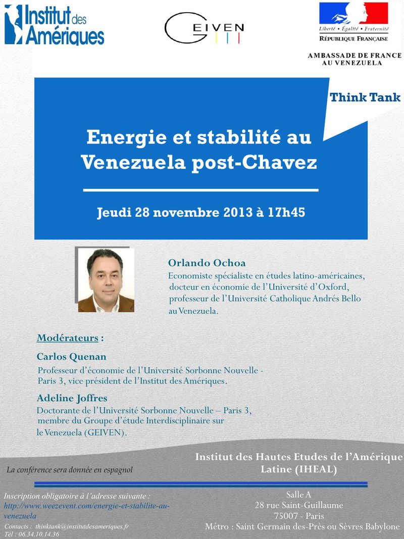 Conférence Energie et stabilité au Venezuela post-Chavez Publié 26 novembre 2013 à 800 × 1067 dans Conférence « Énergie et stabilité au Venezuela post-Chávez » à Paris